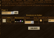 Sur l'écran de situation les terres que vous contrôlez apparaissent avec un petit écu vert (en haut à gauche de chaque province), les terres contrôlées par un autre joueur apparaissent avec un écu rouge. Les barres oranges symbolise l'état générale de la province, plus elle est grande plus la population est importante et le moral bon. Vous voyez l'état des provinces à une certaine distance suivant vos caractéristiques, généralement 1 case. Parfois des personnages (ici, en bas à droite un brigant dans une forêt) ou des croix dorées symbolisent le fait qu'il se passe quelque chose d'inhabituel dans cette province, si vous entrez dans cette case il se passera quelquechose, vous effecturez alors une "quéte". Attention certaines quétes peuvent vous couter la vie si vous n'y étes pas préparé. En baladant le curseur de votre souris sur les provinces, vous verrez apparaître des informations supplémentaires sur leurs propriétaires ou sur ce qu'il s'y passe. |
